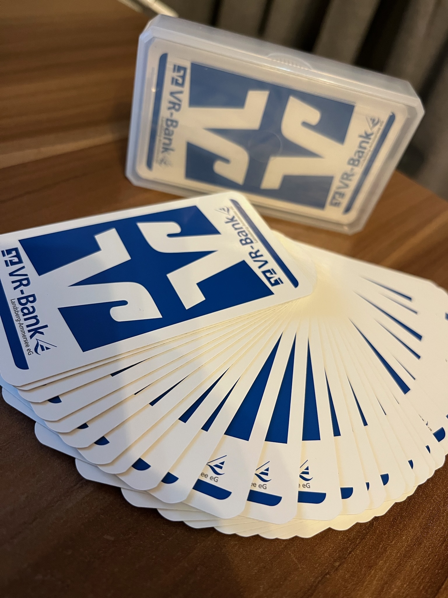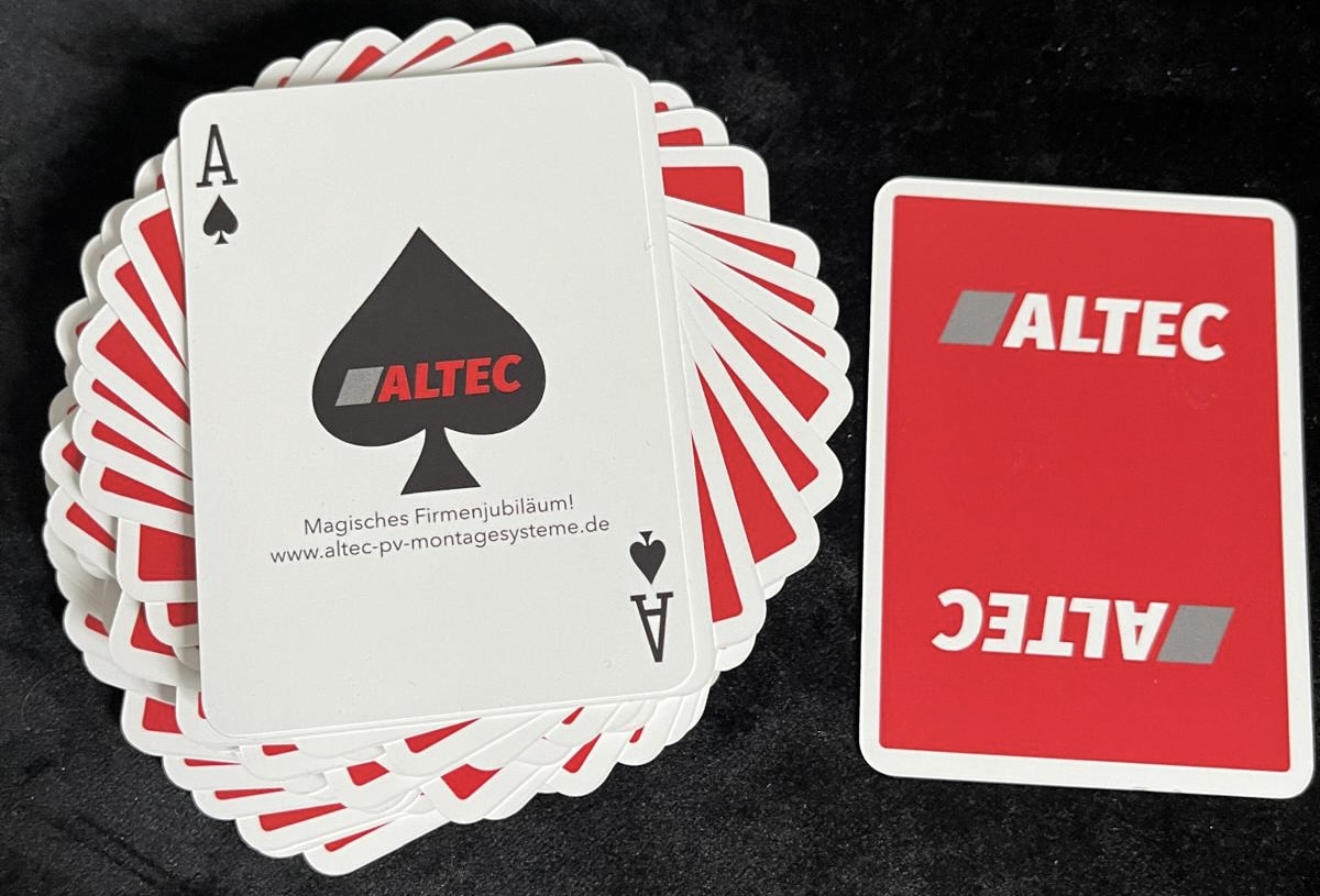 Statt ein gewöhnliches Kartendeck zu verwenden, gestalten wir die Rückseiten mit dem Logo des Unternehmens, einem Teamfoto oder einer besonderen Botschaft. Schon dieser kleine Unterschied sorgt dafür, dass die Gäste neugierig werden – und macht den Effekt unvergesslich.
