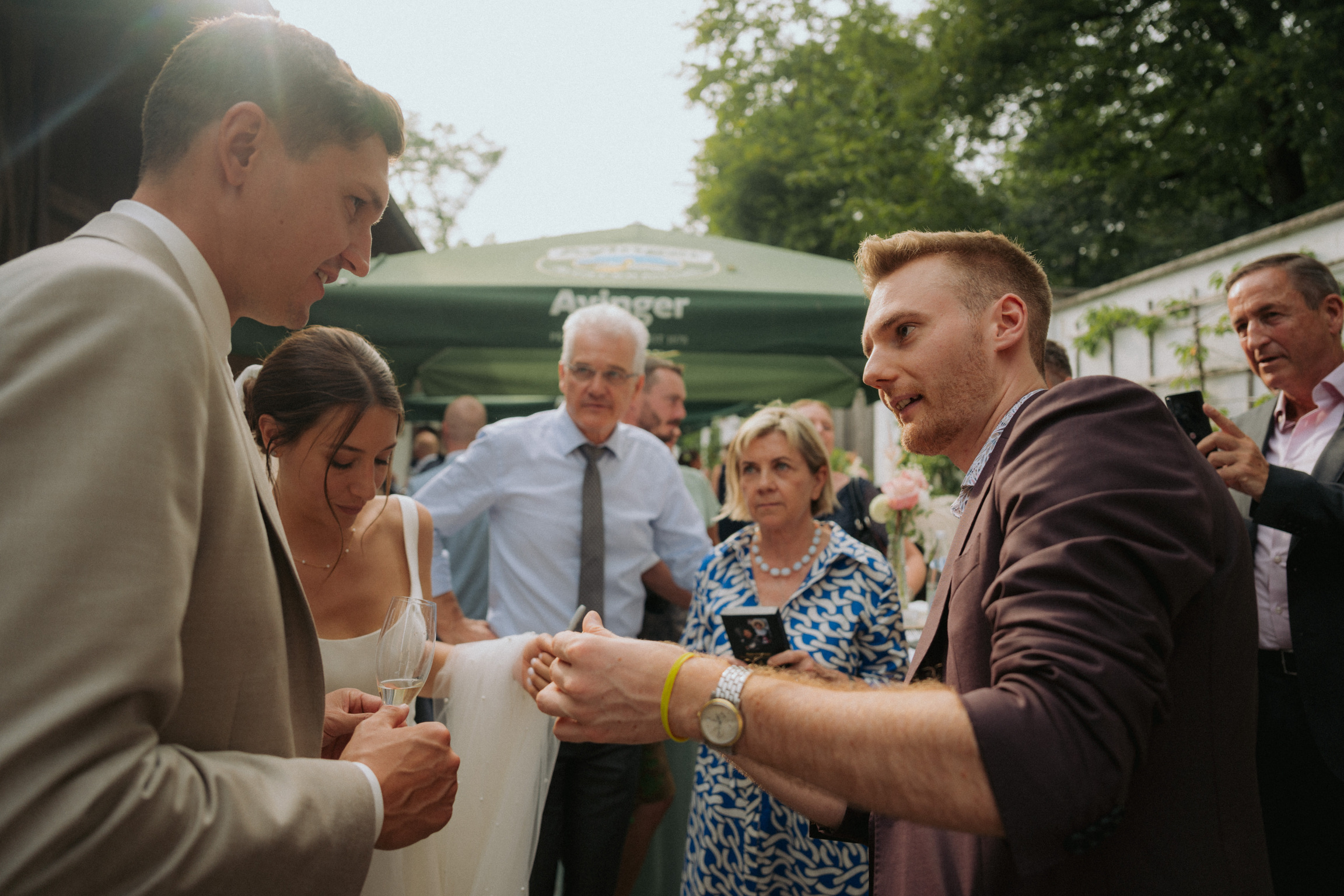 Direkt am Tisch verzaubert Ben Popp die Hochzeitsgäste mit moderner Zauberkunst. Hier beim Sektempfang im Freien. Dafür kann man den Zauberer buchen.